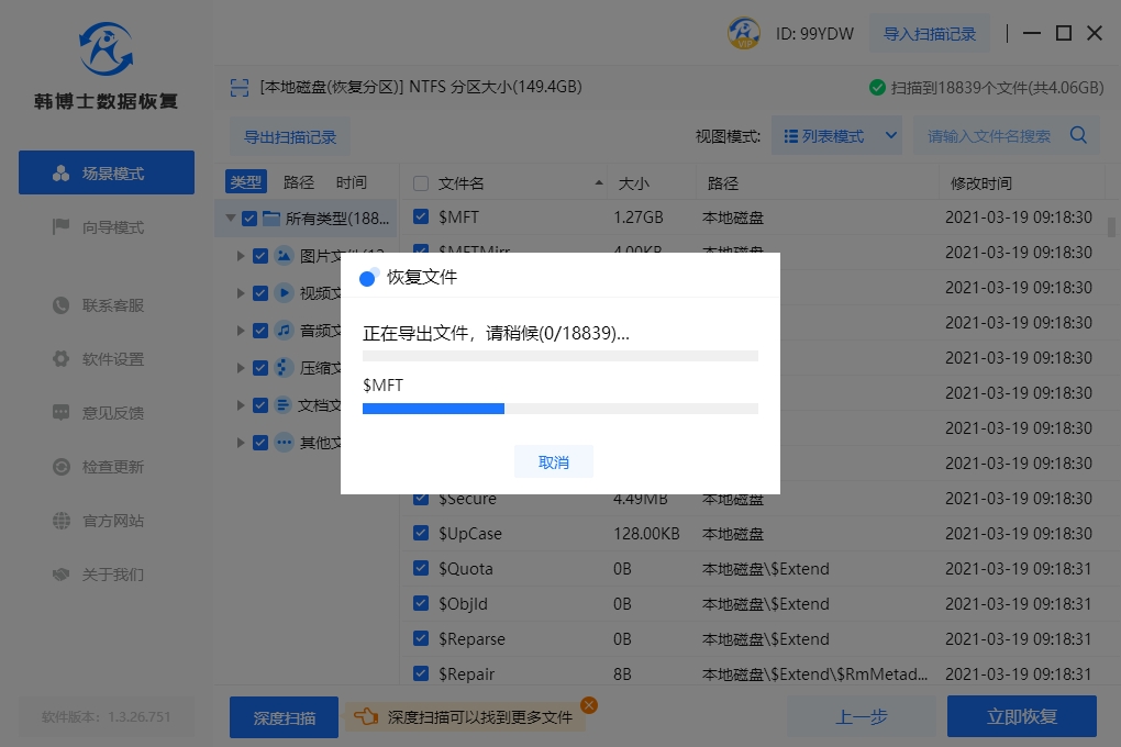 3. 韩博士正在扫描硬盘数据,您不必动手操作,只需耐心等待扫描完毕。等扫描结束后,挑选您需要恢复的文件,然后点一下“立即恢复”,这样就可以了。