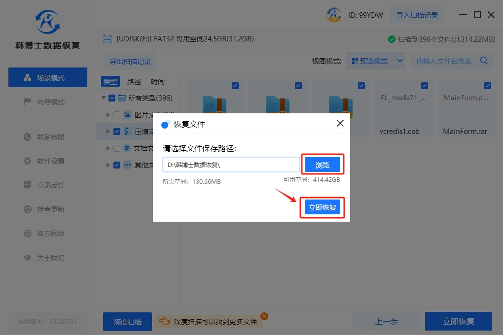 4. 扫描操作完成后,记得使用“预览模式”,来查看每个文件的内容,确保没有任何遗漏。只有确认文件正确无误后,再点击下方的“立即恢复”按钮。