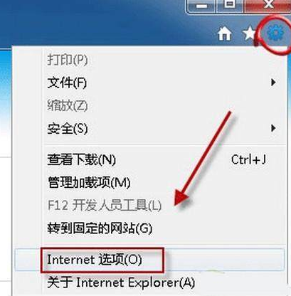 1.打开IE浏览器,找到右上角的设置图标并选择Internet选项进入。