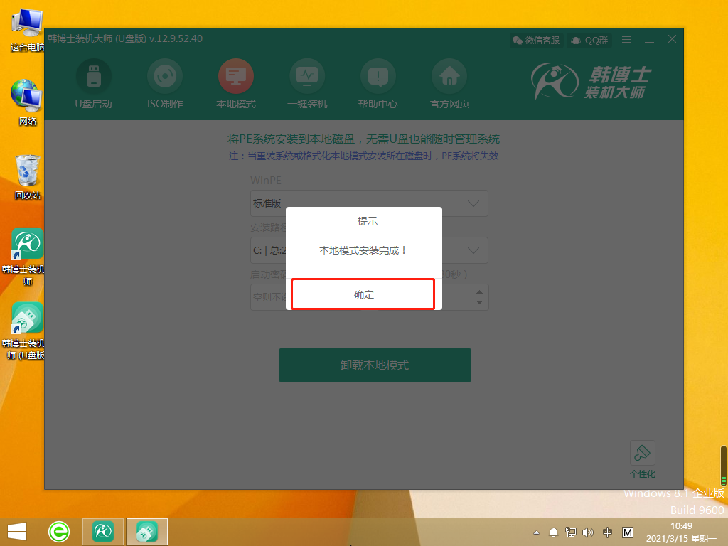 韩博士将下载PE镜像文件,下载完成后,本地模式安装完成。