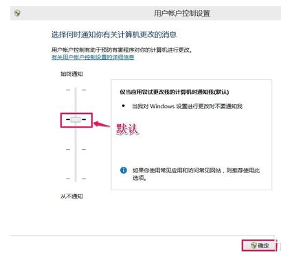 2.进入用户帐户控制设置窗口,用鼠标把左边的滑块往上拉至默认的位置,然后点击【确定】。
