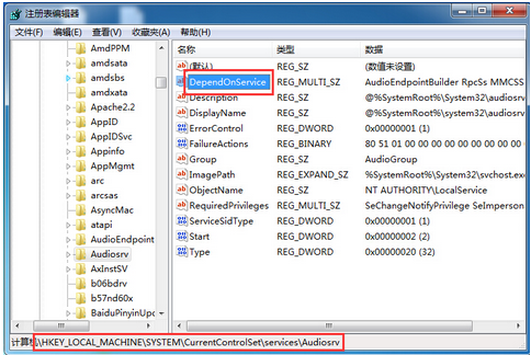 2、然后可以在“注册表编辑器”中,按序点击打开:HKEY_LOCAL_MACHINE/SYSTEM/CurrentControlSet/Services/Audiosrv,并直接在右侧列表中找到DependOnService。