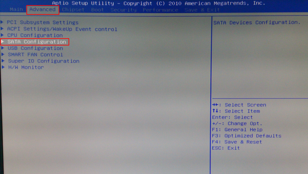 二、进入了BIOS设置之后,使用键盘上的↑↓←→来移动光标,选择“advanced”菜单用回车进入,然后找到SATA Configuration,回车进入。