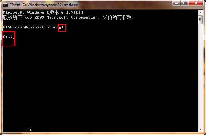 2.接着在打开的dos窗口中输入盘符按回车键,例如小编的u盘盘符是G,那么输入G:然后按回车键即可。