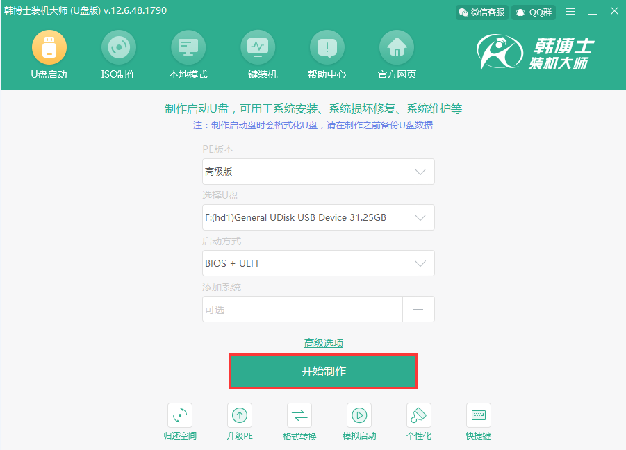 第一步:插入U盘,然后打开韩博士装机大师,在“U盘启动”的选项下,勾选需要制作启动的U盘后,默认设置,点击开始制作。