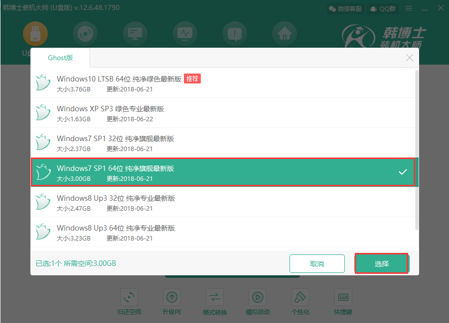 第三步:选择要下载的系统,并制作U盘。韩博士装机大师为我们提供了各种版本的系统,大家可以自行决定制作哪种系统的启动U盘。