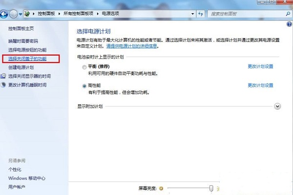 2、在电源选项的面板中,选择点击左侧栏中的“选择关闭盖子的功能”。