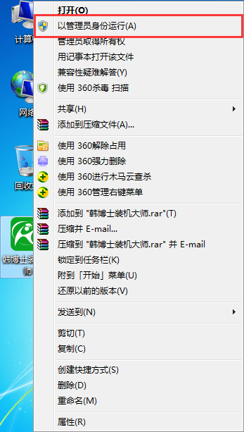 二、在打开韩博士装机大师时,点击鼠标右键,选择“以管理员身份运行”。用管理员打开韩博士装机大师,可以执行系统的一些权限,就不会出现权限不足的问题。