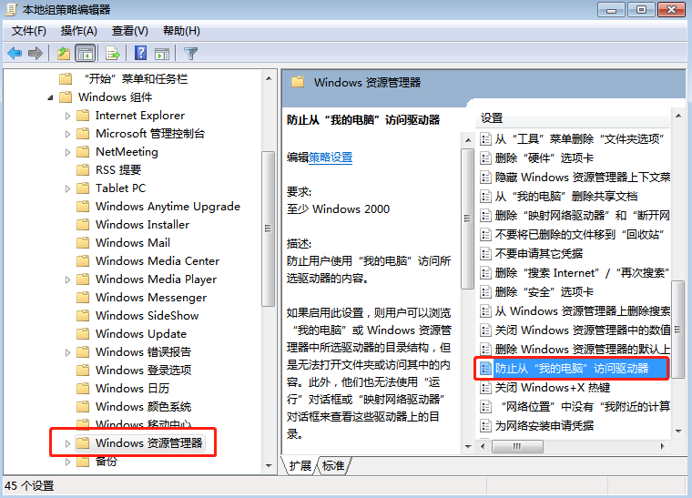 2.在本地组策略编辑器界面中依次点击“用户配置”-“管理模板”-“windows资源管理器”,在右侧找到“防止从“我的电脑”访问驱动器”,如图所示: