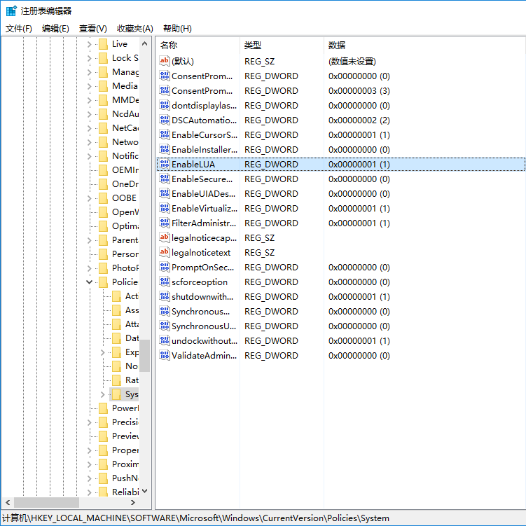 二、打开注册表编辑器后依次打开:HKEY_LOCAL_MACHINE --> SOFTWARE --> Microsoft --> Windows --> CurruntVersion --> Policies -->System。在右侧窗口中点击“EnableLUA”选项;