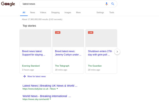 欧盟新版权指令生效后,当地用户将在搜索‘最新消息’时,只能看到基本无用的链接和时间戳 —— 没有内容提要、没有头条新闻或图片、没有任何内容。