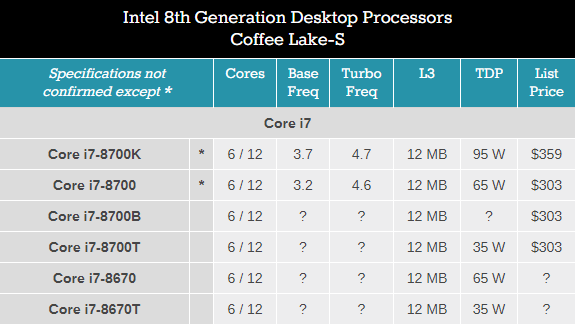 对于桌面版本的Coffee Lake-S,目前发售的只有Core i7-8700K和Core i7-8700两款产品,Intel接下来还会继续发售4款Coffee Lake Core i7处理器,除了超低TDP(意味着低频率低发热)的T后缀产品外还有一款B后缀的Core i7-8700B,推测这款产品是针对企业市场的特殊型号。
