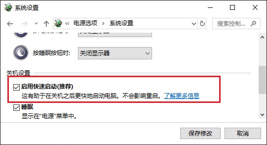 4.最后,勾选“启用快速启动”按钮即可,这样win10电脑开机速度会快一些了。