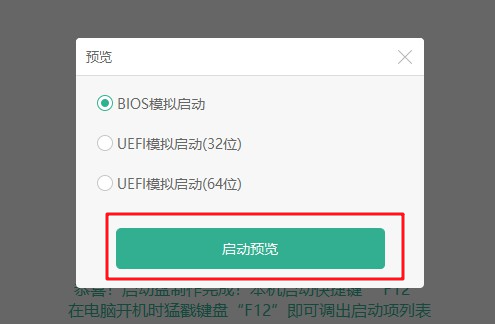 5.韩博士U盘启动盘制作完成后,会进行U盘启动模拟预览窗口,可勾选“BIOS模拟启动”选项,点击“启动预览”进行测试。